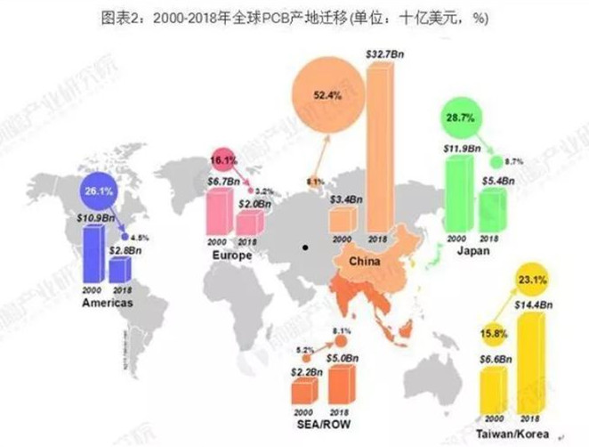 PCB產(chǎn)業(yè)在世界范圍內(nèi)廣泛分布,歐美發(fā)達國家起步早,研發(fā)并充分利用先進的技術(shù)設(shè)備,故PCB行業(yè)得到了長足發(fā)展。近二十余年,憑借亞洲尤其是中國在勞動力、資源、政策、產(chǎn)業(yè)聚集等方面的優(yōu)勢,全球電子制造業(yè)產(chǎn)能向中國、中國臺灣和韓國等亞洲地區(qū)進行轉(zhuǎn)移。