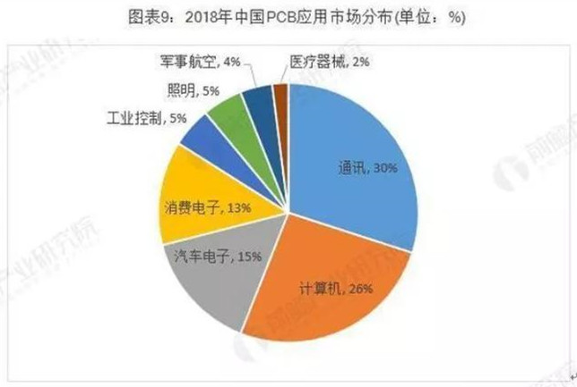 電子信息產(chǎn)業(yè)的蓬勃發(fā)展是PCB行業(yè)發(fā)展的重要助力。從下游應(yīng)用領(lǐng)域分布來看,2018年通訊行業(yè)的PCB市場規(guī)模最大,占比約為33.4%;其次是計算機行業(yè),占比約為29.4%。其他領(lǐng)域PCB市場規(guī)模較大的是消費電子、汽車電子。
